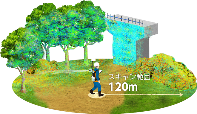 16ラインのレーザースキャナーユニットにより、最大320,000点/秒の高速スキャンが可能です。スキャン範囲は最大120mで、屋内外を問わず効率的な計測を実現します。