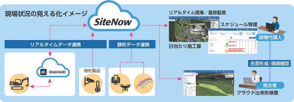 『SiteNow』は、リアルタイム施工マネジメントシステム『Sitelink3D』と連携して取得するICT建機の施工履歴データに加え、スキャナー等で取得した点群データや各種IoTセンサーから得られる現場情報など、多様なデータをクラウド上で一元的に統合します。これにより、リアルタイムに現場全体の作業状況を把握し、工程の遅れや手戻りを未然に防ぐための速やかな意思決定を支援します。